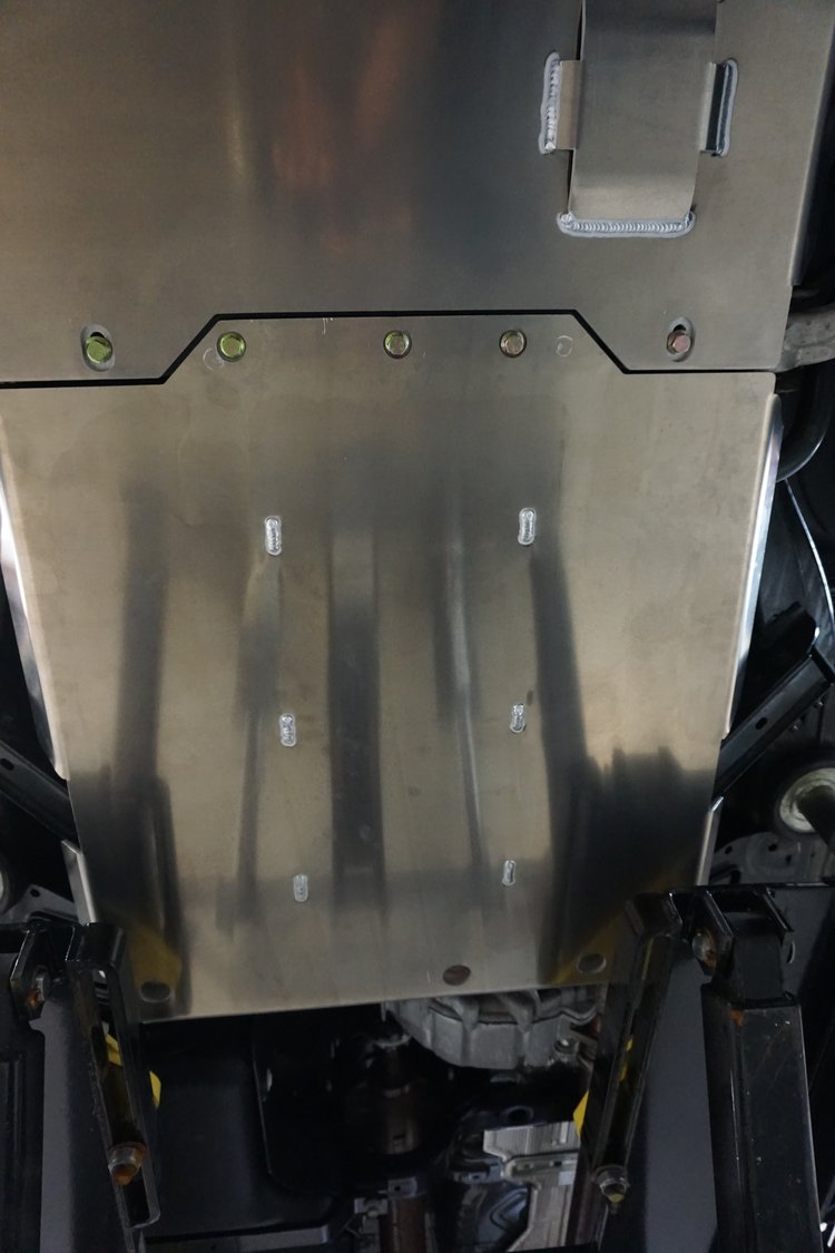 - Transmission skid plate bolts to the frame using 6 supplied yellow zinc grade 8 flange bolts