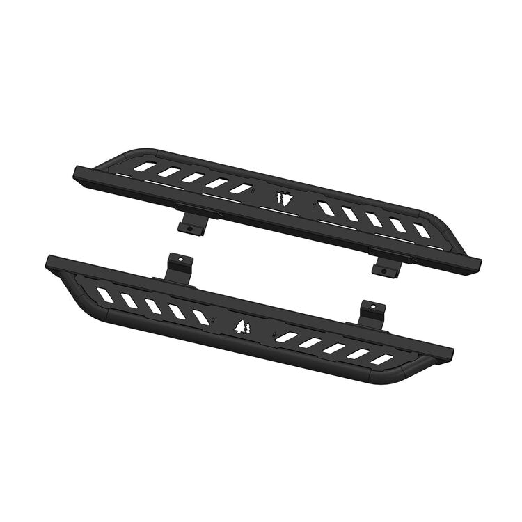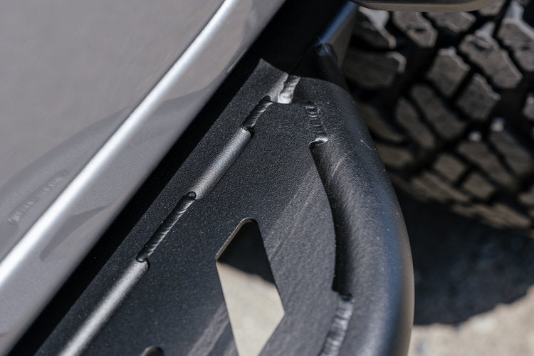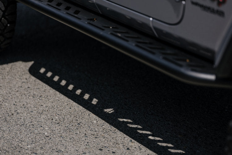 Our Aluminum Side Steps are made from 3/16” thick 6061 aluminum and mount to the factory locations along the pinch seam and underbody with 6 bolts per side.